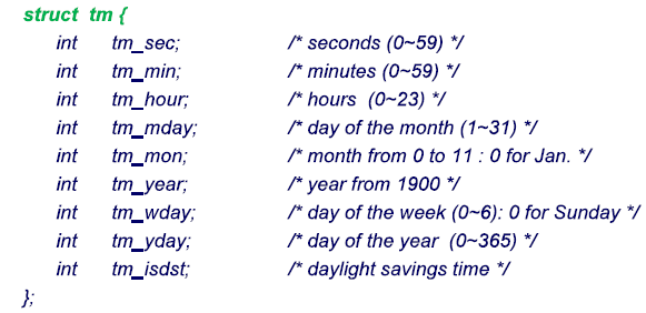 tm은 시간과 관련된 변수들이 저장되어 있는 구조체이다. 이 구조체를 이용하여 시간과 관련된 여러 설정을 할 수 있다.