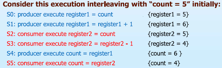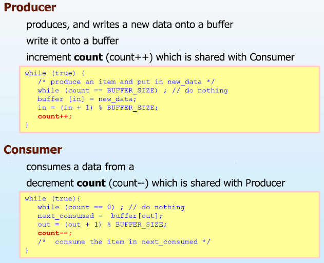 두 프로세스가 실행된다고 생각해보자. 여기서 공유되는 자원은 count이다. producer에서 증가시키고 consumer에서 감소시키니 count의 값은 결국 그대로일 것이라고 생각할 수 있다. 하지만 이것도 동기화를 시키지 않으면 어떤 값을 가지게 될 지 아무도 모른다.