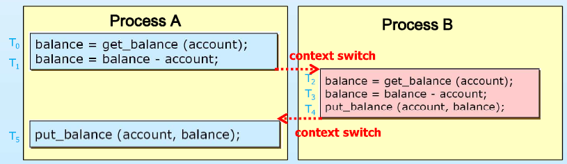 두 개의 프로세스가 현금을 인출하는 상황이다. balance가 100만 원이고 account가 10만 원이라 가정해보자. 100만 원에서 10만 원을 인출한 순간에 갑자기 context switch가 일어나서 다른 프로세스가 실행되었다. 프로세스 B는 이미 10만 원이 인출되었음에도 제대로 저장되지 않았으므로 원금을 100만 원으로 인식하고 다시 10만 원을 인출하여 잔액은 90만 원이 된다. 2개의 프로세스가 10만 원씩 인출하여 총 20만 원이 인출되었음에도 잔액은 90만 원이 되는 것이다.